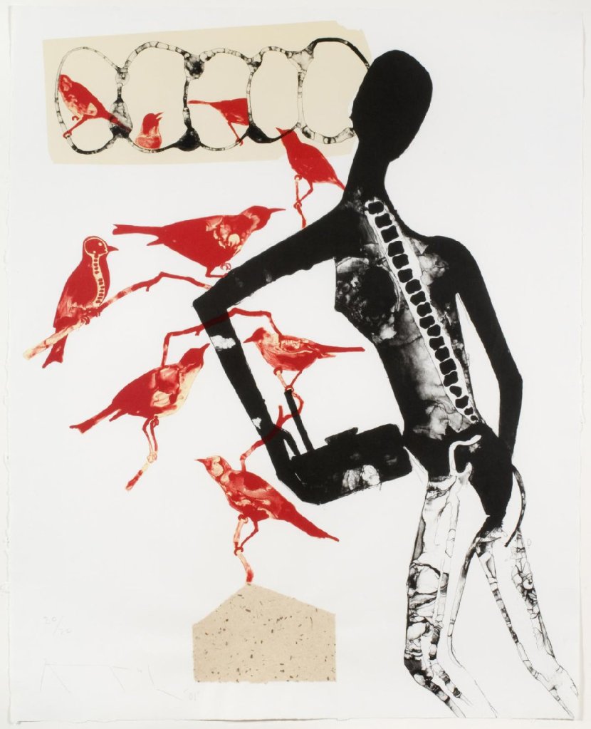 Sabari the hermit intertwines with the birds. Her arm seems to go through the branches, or maybe it’s posed in front, blocking a perfect view of their resting place. She poses like a model, her right arm in her pocket and her left at a right angle, her back arching while her neck cranes forward. I can’t help but wonder if her pose represents her contentment with the life of the birds or if she contorts her body to match the uncomfortable feeling. She both seems leaning away and towards the birds and the branches. She feels more at home with them, but dreams of a different life, one with people and fantasies. I’m struck by the notches of her spine, each one distinguished and layered and moving diagonally down her back. Maybe she’s aware of the way her spine ladders to the heavens, to the birds, that her body is combined with the fate of something more. It calls out to the way wings glide across the landscape, flap with each breath, continuing an effortless journey.