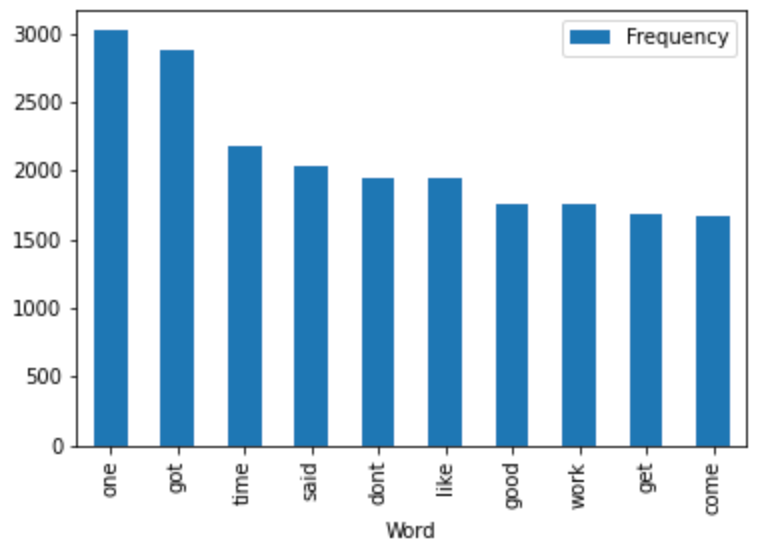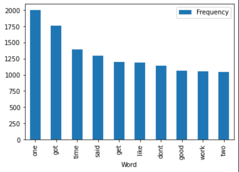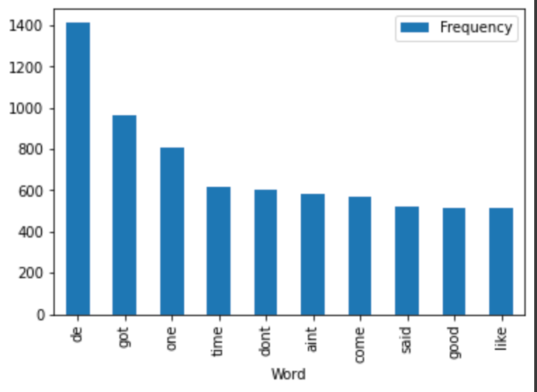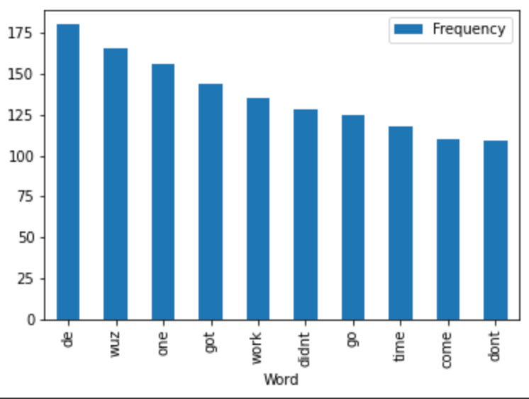 In order to conduct text analysis, the program Google Colab was used to create text visualizations. Google Colab is a collaborative medium to run Python code. We ran code that incorporated Pandas, a software library that aids in data analysis. Pandas created data frames out of our Life History spreadsheet data, data that contained multiple metadata categories on selected Life Histories as well as the raw text from each Life History, that could then be used to analyze the word frequency of a particular data frame. Data frames could be a specific metadata category out of our spreadsheet. I was interested in looking at the text variation between interviewees of different races, and created new data frames for interviewees of a “white” or “black” racial identity and writers of a “white” or “black” racial identity, then ran code that generated word frequency graphs for these data frames.